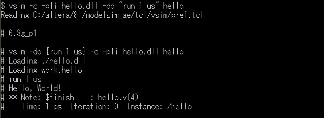 vsim -c -pli hello.dll -do "run 1 us" hello